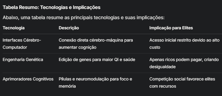 Parece provável que essas tecnologias sejam inicialmente acessíveis apenas às elites devido ao alto custo e à concentração de riqueza. Em um sistema capitalista competitivo, apenas os ricos poderão pagar por implantes cerebrais ou terapias genéticas, criando uma divisão entre os "super-humanos" e o resto da sociedade. A pesquisa indica que a desigualdade econômica, com poucos indivíduos controlando recursos vastos, pode exacerbar essa restrição, deixando a população geral sem acesso. Isso pode levar a uma nova forma de desigualdade, onde elites geneticamente ou tecnologicamente aprimoradas dominam áreas como educação e trabalho.