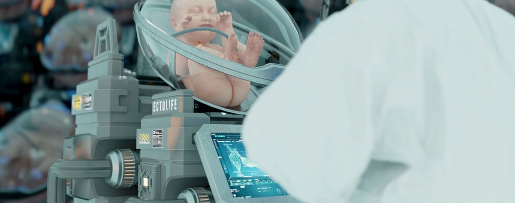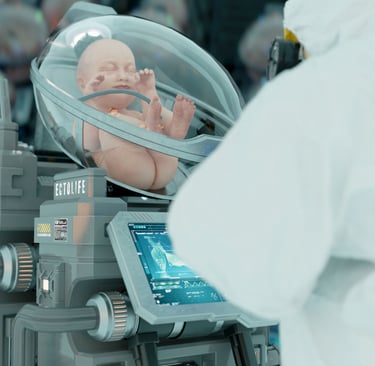 Em 2075, a engenharia genética atingiu um nível de precisão impressionante. O CRISPR-Cas9 evoluiu para uma versão avançada capaz de editar múltiplos genes simultaneamente, permitindo a seleção de traços como inteligência, saúde e longevidade. Genes como o RIM1, associados ao QI, são manipulados para maximizar o potencial cognitivo. Empresas de biotecnologia, controladas por conglomerados globais como o fictício "Clube Bilderberg Tecnológico", oferecem pacotes de "bebês sob medida" — mas apenas para quem pode pagar milhões. O custo elevado e regulamentações restritivas garantem que somente as elites tenham acesso, enquanto a população geral depende de fatores ambientais limitados para seu desenvolvimento cognitivo.Ectogênese: Úteros Artificiais como Realidade