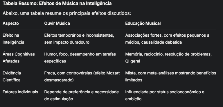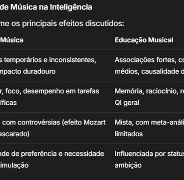 A música tem um impacto significativo nas funções cerebrais, mas seu efeito na inteligência é mais indireto e complexo do que frequentemente sugerido. Para ouvir música, os benefícios parecem ser mais relacionados ao estado de espírito e foco, enquanto a educação musical pode oferecer vantagens cognitivas, especialmente em crianças, mas requer mais pesquisas para estabelecer causalidade. É essencial considerar fatores como design do estudo e variáveis demográficas ao interpretar resultados.