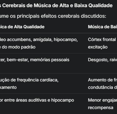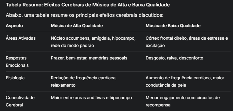 Estudos indicam que música de alta qualidade ativa áreas como o núcleo accumbens, ligado ao prazer, e a amígdala, relacionada às emoções, promovendo respostas positivas. Já a música de baixa qualidade pode aumentar a atividade em regiões associadas a emoções negativas, como o córtex frontal, e causar maior excitação fisiológica, como aumento da frequência cardíaca.