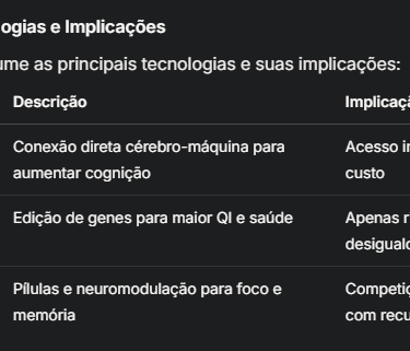 Divisão Social: Há preocupações de que isso possa levar à criação de duas espécies humanas, uma aprimorada e economicamente dominante, e outra sem acesso, como sugerido em "Transhumanism: billionaires want to use tech to enhance our abilities – the outcomes could change what it means to be human" (Transhumanism billionaires). Isso pode exacerbar desigualdades, com elites usando essas tecnologias para reforçar poder político e social.
