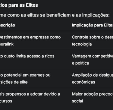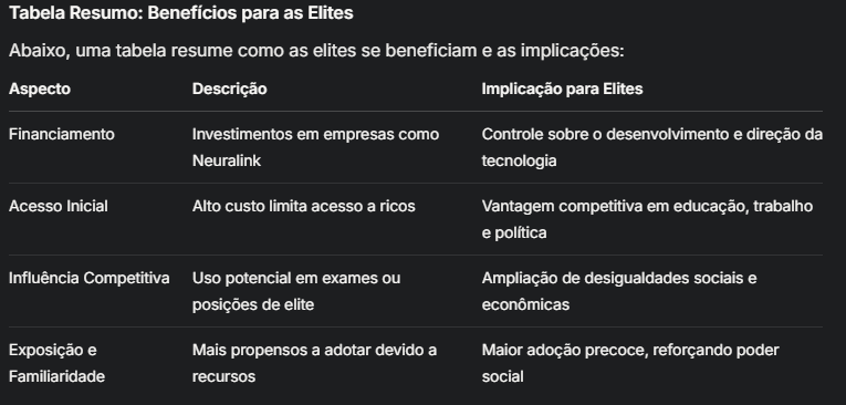 As elites já se beneficiam indiretamente ao financiar e influenciar o desenvolvimento dessas tecnologias. A Neuralink, por exemplo, recebeu mais de $680 milhões em financiamento até 2025, com investidores como o Founders Fund (de Peter Thiel) e Google Ventures, além de Elon Musk, que investiu pessoalmente mais de $100 milhões (Neuralink - Funding, Financials, Valuation & Investors). Como o custo inicial é alto, é provável que apenas os ricos tenham acesso a esses aprimoramentos cognitivos, criando uma vantagem competitiva em áreas como educação, negócios e política. Isso pode levar a uma sociedade dividida, onde elites têm capacidades cognitivas superiores, enquanto a população geral fica para trás (Public cautious about enhancing cognitive function using computer chip implants in the brain).