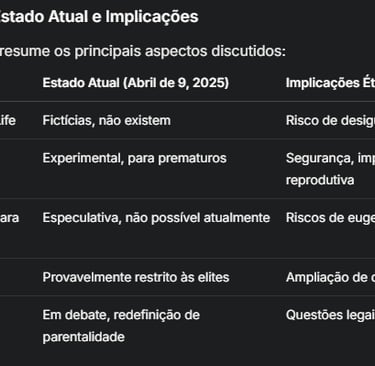As implicações éticas incluem riscos de eugenia, onde traços são selecionados com base em preferências sociais, potencialmente perpetuando desigualdades. Um artigo do PMC, "Form, Function, Perception, and Reception: Visual Bioethics and the Artificial Womb" (Form, Function, Perception, and Reception: Visual Bioethics and the Artificial Womb - PMC), discute como úteros artificiais poderiam alterar percepções do feto em desenvolvimento e restringir a liberdade reprodutiva das mulheres, além de destacar preocupações com a segurança e o impacto na igualdade de gênero. Outros debates incluem a redefinição de parentalidade e o status moral de fetos crescidos em úteros artificiais, como discutido em "Ethics Considerations Regarding Artificial Womb Technology for the Fetonate - PubMed" (Ethics Considerations Regarding Artificial Womb Technology for the Fetonate - PubMed).