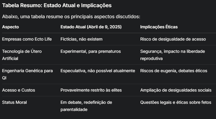 Pesquisas sugerem que empresas como Ecto Life não existem, e a escolha do QI através de ectogênese permanece especulativa até abril de 9, 2025. A tecnologia de úteros artificiais está em estágios iniciais, focada em aplicações médicas, enquanto a engenharia genética para inteligência enfrenta barreiras científicas e éticas. É essencial abordar essas questões para evitar desigualdades e garantir que os benefícios sejam amplamente compartilhados, caso tais tecnologias se tornem viáveis no futuro. Com base nessas tecnologias, podemos imaginar um futuro como o descrito a seguir, onde as desigualdades se intensificam.