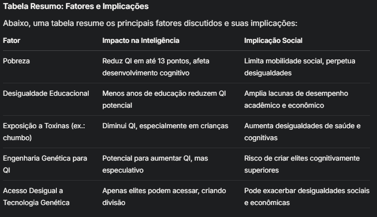 Se a engenharia genética para aumentar o QI se tornasse acessível, é provável que apenas elites, com recursos financeiros, pudessem utilizá-la, potencialmente ampliando a lacuna cognitiva (Genetic Engineering Will Make Income Inequality Much Worse). Historicamente, novas tecnologias tendem a exacerbar desigualdades, como visto na divisão digital (The digital divide as a complex and dynamic phenomenon). Cenários futuros, como os retratados em ficção científica, sugerem riscos de uma sociedade dividida entre "superinteligentes" e o resto, mas isso permanece especulativo (Gattaca and the Ethics of Genetic Engineering).